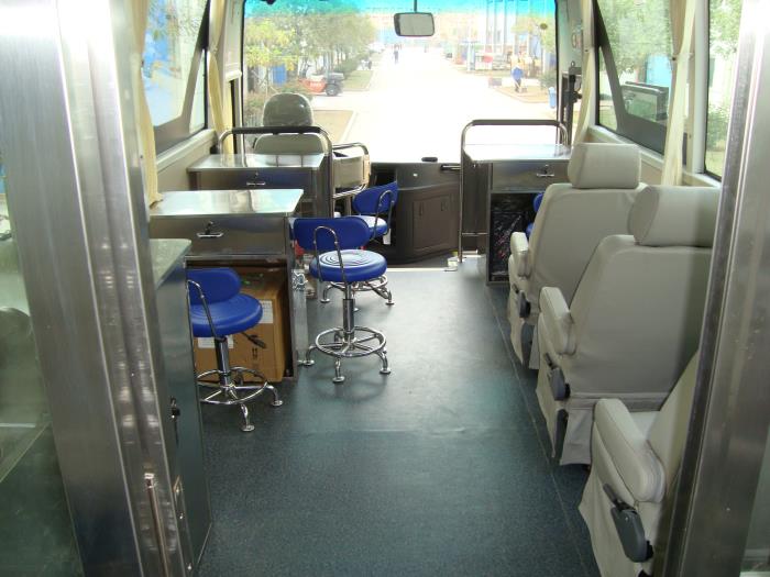 采血车的布局、工作流程符合流动采血专业规范,符合卫生学要求,并力求温馨、优雅、舒适;业务工作区域内污染区与非污染区分开,各区以功能划分为献血者征询体检区域、检验区域、采血区域、急救区域、休息区域、各区配备相应工作台、物品储纳柜及座椅。